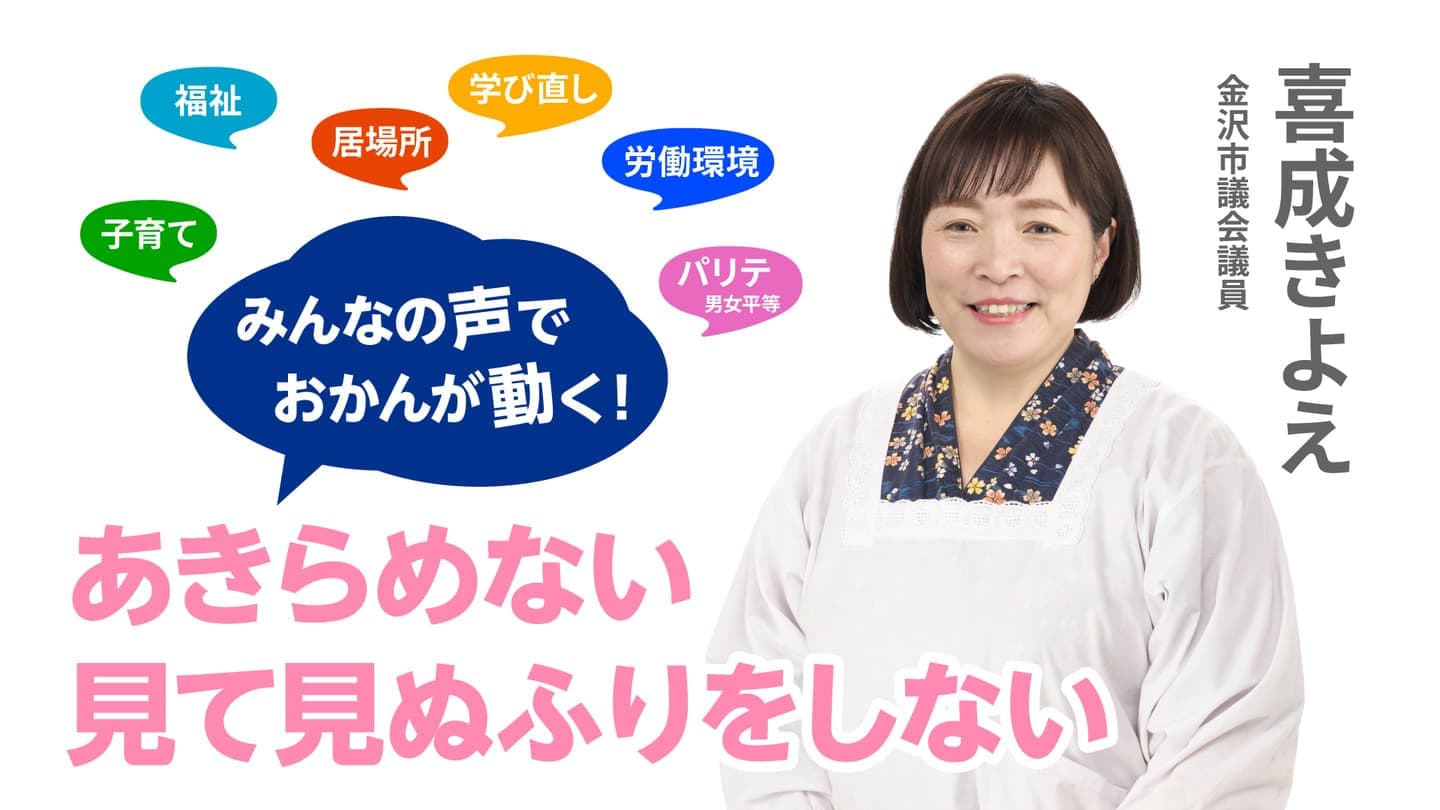 「どうせ政治は変わらない」と思わせてしまっている今の社会を「自分たちが立ち上がれば社会は変わる」と感じてもらいたい。「こども食堂」「子育て支援」「夜間中学」「ヤングケアラー支援」など前進させることができたのも、仲間や市民の方々がともに行動して下さったからです。 理不尽なことには「NO」をいえる「だまらない金沢」を目指します。